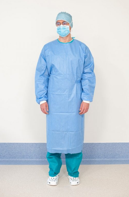 Svetlomodrý plášť vyrobený z netkanej textílie SMS s minimálnou hmotnosťou 35 g/m² s rovnými rukávmi a s pletenými polyesterovými manžetami. Aplikácia: ochrana pred prenosom infekcie z operačného tímu do operačnej rany ochrana pred rozptylom exfoliovaných častíc epidermy vo vzduchu na operačne... celý popis
