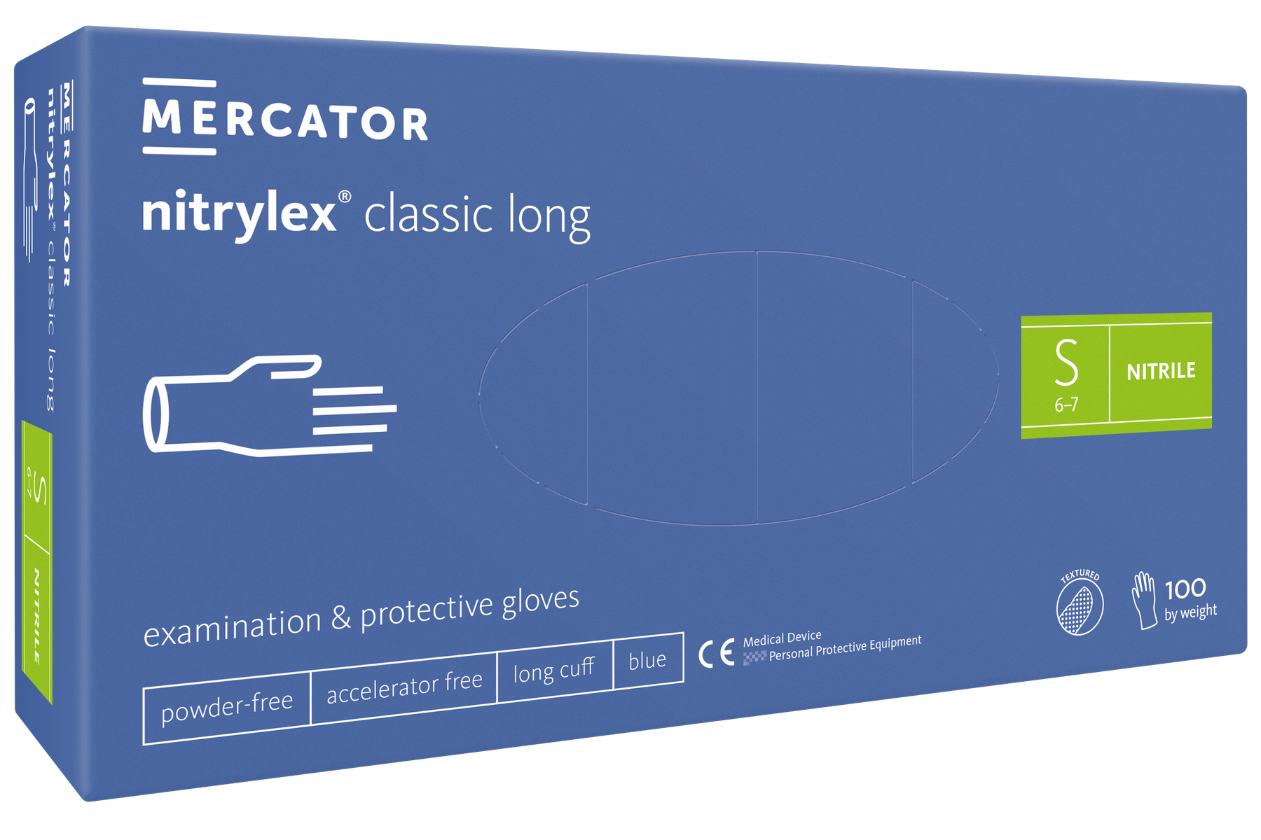 MERCATOR nitrylex classic long sú diagnostické nitrilové rukavice, ktoré vďaka predĺženej manžete zaručujú dodatočnú ochranu v časti ruky nad zápästím.