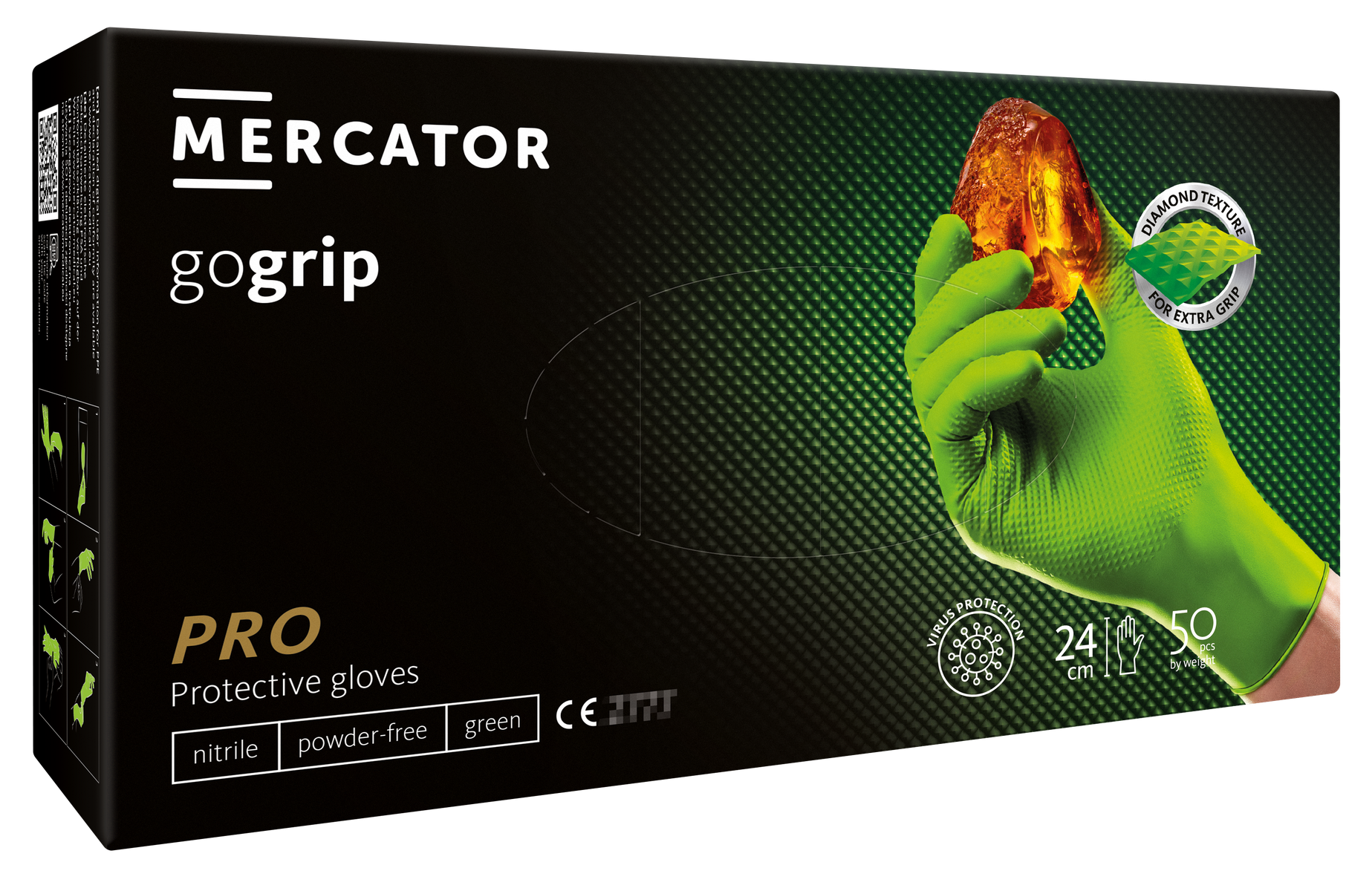 Mimoriadne flexibilné MERCATOR gogrip sú 3-krát hrubšie ako štandardné rukavice dostupné na trhu. Tieto rukavice vyrobené z odolného nitrilu obsahujú revolučnú 3D diamantovú textúru, vďaka ktorej je váš úchop pevný a stabilný bez kompromisov vo vašej presnosti. Originálna štruktúra MERCATOR go grip znamená, že manipuláciu s mobilnými zariadeniami je možné vykonávať bez vyzliekania rukavíc – vaše ruky sú tak neustále chránené pred vonkajšími faktormi. Vďaka unikátnemu dizajnu sa vám nepotia ruky, takže ste menej vystavení podráždeniu pokožky. Dokonale vypasovaná manžeta rukavice zaručuje pohodlie pri práci a dokonale viditeľná, intenzívna zelená farba vynikne v akomkoľvek prostredí.
