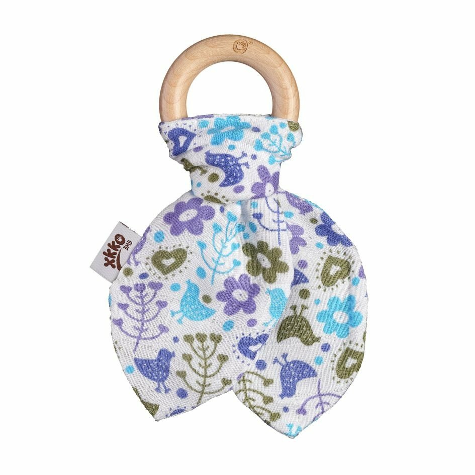 Drevené hryzátko XKKO BMB so šuštivými lístkami z extrémne jemného bambusového mušelínu. Bambusová viskóza je antibakteriálna a nespôsobuje žiadnu alergickú reakciu.